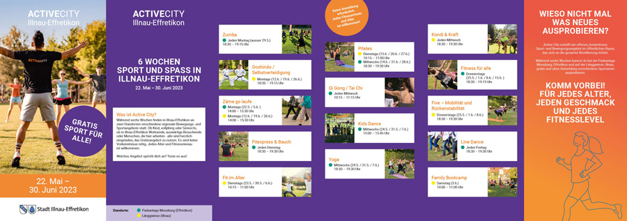Die Stadt Illnau-Effretikon bietet in enger Zusammenarbeit mit diversen Sportvereinen und lokalen Anbietenden 60 Kurslektionen in 14 verschiedenen Sport- und Bewegungsarten für die gesamte Bevölkerung an. Die Kurslektionen finden in Illnau auf der Länggwiese und in Effretikon bei der Parkanlage Moosburg statt.